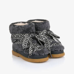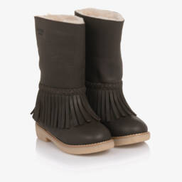 Girls beige boots by Donsje, made in smooth, durable leather. Cosy and warm, they have a wool felt lining and an outer shaft made in soft, fluffy wool. There is a pretty ruffle trim and a sturdy crepe sole for good grip. The side zip fastening ensures they are easy to put on and take off.