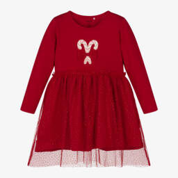 Girls beige dress by NAME IT, embellished with shimmering sequins for a touch of sparkle. This elegant style has long sleeves and a black velvet bow on the back for a lovely contrast. Lined in stretchy jersey, it is comfortable to wear and simply slips on over the head.