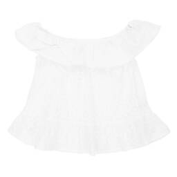 Girls white blouse by Dr. Kid, made in soft cotton jersey with a touch of stretch for comfort. This charming top has a wide rounded collar with pretty scalloped trims, and long sleeves with elasticated cuffs. There are popper fastenings on the front for a neat finish.