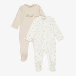 This lovely pale yellow and ivory babysuit set for girls by Mayoral, is made in soft cotton jersey, with a delicate striped pattern. Cosy and comfortable, the top has an adorable fairy motif and fastens on the front with poppers. The trousers have enclosed feet and a gently elasticated waistband for a great fit. A sweet, knotted hat completes the look.