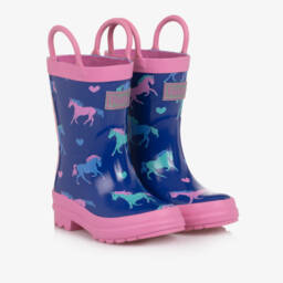 Girls blue rain boots by Hatley, with a pretty pink bow pattern and pink trim. These waterproof boots have a soft fabric lining, a moulded footbed and a deep tread, non-slip sole for good grip. Ideal for splashing in puddles, they are both practical and stylish.
