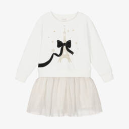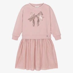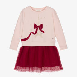 This pink dress by Lili Gaufrette, brings a touch of elegance to any girl's wardrobe. Made in a soft, lightweight viscose blend, the upper part is finely knitted with a charming bow on one shoulder and pretty puffed sleeves. The skirt is finely pleated, adding a sophisticated flair.