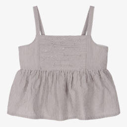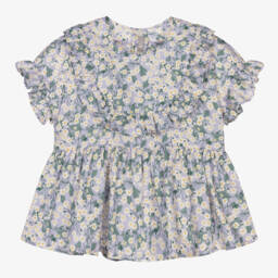 A lovely pink blouse for little girls by Il Gufo, made in soft cotton poplin. This pretty, lightweight top has a delicate floral print and a charming ruffle neckline. There are buttons on the front and elasticated cuffs, ideal for little ones on the move.