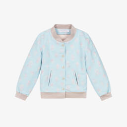 Girls beige and pink bomber jacket by Atelier Choux Paris, woven with a delightful jacquard pattern of hot air balloons. Stylish and warm, it is trimmed with soft ribbing and lined with silky satin. There are pockets on the front and large, iridescent buttons to fasten.