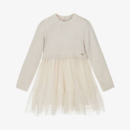 The girls pink knitted and tulle dress by Mayoral beautifully blends a cosy knit top with a delicate tulle skirt. This charming piece features long sleeves and elegant detailing, perfect for autumn and winter occasions. The soft pink hue adds a touch of sweetness, while convenient back buttons ensure easy dressing. Ideal for special outings or family gatherings, this dress is available in limited quantities, so don't miss this last chance to buy.