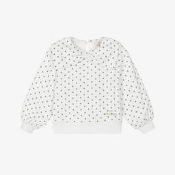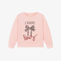 Little girls pink sweatshirt by Lili Gaufrette, made in soft cotton jersey with a warm, fleecy inside. Cosy and comfortable, this casual top has a large collar with a stylish bow on the front. For a signature finish, there is a gold-tone script logo printed on the front and branded gold-tone poppers on the back for easy dressing.