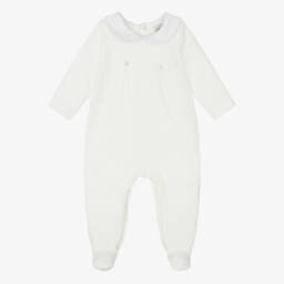 Girls pink babygrow with feet by Givenchy showcases a charming pattern of stars and logos, designed for warmth and cosiness. This soft and comfortable babysuit features a front popper fastening for easy dressing and a secure fit, ensuring gentle comfort against delicate skin. Perfect for keeping warm during the cooler months, this luxurious piece is ideal for both daytime wear and cosy nights. Limited quantities available, offering a last chance to buy this elegant addition to a little one's wardrobe.