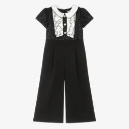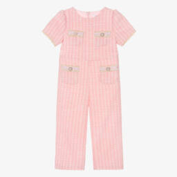 This elegant red jumpsuit for girls by Patachou is a smart choice for a special occasion. The short-sleeved top is made in a charming tweed, with a velvet bow and sparkling diamanté embellishment. The wide-leg trousers are pleated and the concealed zip fastening on the back offers a neat finish. It is lined in soft cotton for comfort.