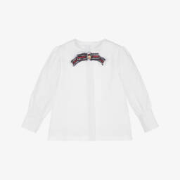 A lovely white blouse for girls by Patachou, exclusive to Childrensalon. Classically styled, it is made in soft, lightweight cotton, with sweet puffed sleeves and a smart stand-up collar. A large bow and gold crest button complete the charming look.