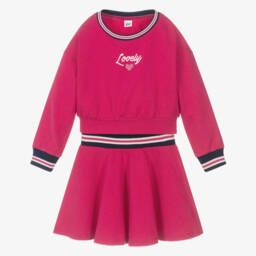 Girls grey and white skirt set by iDO, with a matching bag. The pleated skirt is made in soft, stretchy jersey with a comfortable elasticated waistband. The bag has a pretty faux pearl and diamanté embellishment, with a gold chain strap. The white blouse is lightweight and sheer, with a ruffle collar and elasticated cuffs. A diamanté logo and slogan add a touch of sparkle to the front and a jersey lining ensures comfort.
