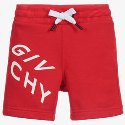 Blue shorts for younger boys by luxury French brand Givenchy Kids, made in soft cotton sweatshirt jersey. They have side pockets and a drawstring waist, with a black Refracted Givenchy logo on the front and back of one leg.