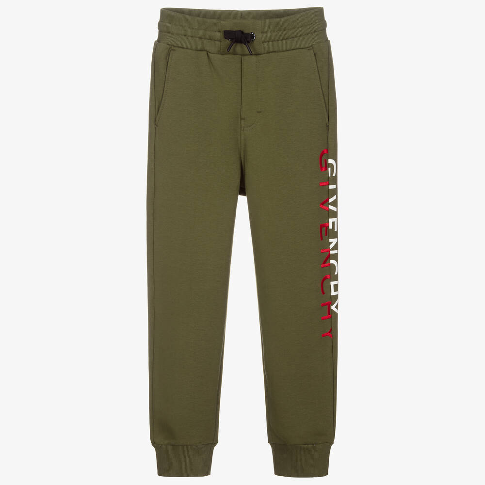 Khaki green joggers for teen boys by luxury French designer Givenchy Kids, with a luxe sporty vibe. Made in comfortable cotton jersey with a loose fit, they have a useful drawstring waistband. The Givenchy Kids Split signature logo is embroidered and printed on one leg in red and white.