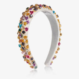 Girls white double strap hairband by Graci features exquisite crystal and gold metal embellishments. The dual bands are delicately wrapped in soft satin ribbon, with one band showcasing larger jewels for added elegance. Perfect for special occasions, it offers a touch of luxury to any outfit. With limited quantities available, this is a last chance to buy a truly unique accessory for stylish girls.