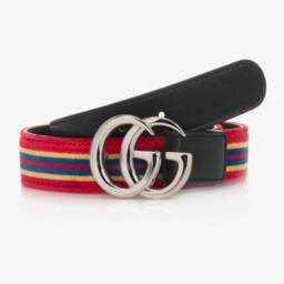 The boys green and red braided belt by Gucci features the brand's iconic colour scheme in a stylish woven design. This elasticated accessory includes a smooth brown leather trim and an adjustable silver buckle, providing a comfortable fit. A great blend of fashion and function, it adds a touch of luxury to any outfit. Limited quantities available, making it a must-have addition to your child's wardrobe.