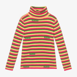Junior boys orange stripe knit jumper by Gucci features a retro-inspired design with blue and white intarsia stripes, including the iconic logo. Crafted from soft, stretchy wool, it offers both warmth and comfort, making it suitable for cooler days. The roll neck design adds a chic touch, lovely for pairing with jeans or trousers. Limited quantities available, making this a must-have addition to any stylish wardrobe.