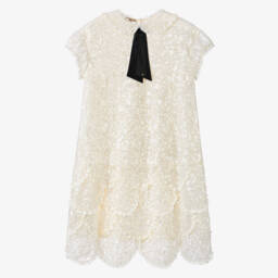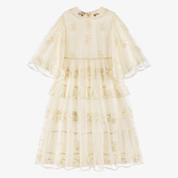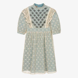 The teen girls ivory silk and cotton dress by Gucci exudes timeless elegance with its iconic Double G logo embroidery. Crafted from luxurious cotton and silk, this dress features a delicate lace stand-up collar and intricate floral cut-work, offering a sophisticated touch. Suitable for special occasions, it includes a removable cotton lining and fastens with a concealed zip and buttons for a seamless finish. Limited quantities available, making it a must-have for discerning wardrobes.