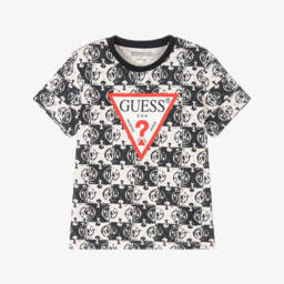 This junior boys printed cotton T-shirt by Guess features a distinctive beige and ivory design with the brand's iconic Triangle logo in vivid white, black, and orange. Crafted from soft jersey fabric, it incorporates an animal-style print with additional logos for a trendy look. Perfect for spring and summer outings, it offers comfort and style in one. Limited quantities available, so don't miss out on adding this eye-catching piece to the wardrobe.