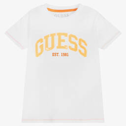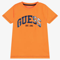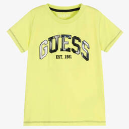 Black cotton T-shirt for little boys by American brand Guess, made in comfortable jersey for relaxed days. It has the designer's shiny, rubberised green logo on the front, with lime green overstitching on the cuffs and hemline. This T-shirt contains in-conversion cotton fibre.