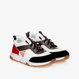 Bright blue faux leather trainers for boys by Guess, fastening with white laces. The soft uppers have tonal blue trims, with an embossed logo on the side and logo patch on the tongue. The lining is made in soft textile with a breathable moulded leather footbed for comfort. They have a chunky white rubber non-slip sole.