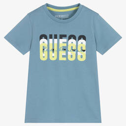 White cotton T-shirt for little boys by American brand Guess, made in all-day comfortable jersey. It has the designer's bold repeat logo on the front, in lime green, black and orange. This T-shirt contains organic cotton fibre.