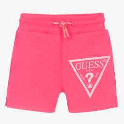 Ivory jersey shorts for girls by Guess, made in soft and mid-weight organic polycotton jersey. With a drawstring waist, they have two side pockets and a pink Triangle logo on the front.