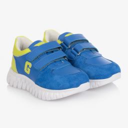 Grey and lime green leather trainers for little boys by Guess, fastening with velcro straps. The uppers have lime green trims, a matching 'G' logo on the side and a faux suede toe. They have a comfortable textile insole and a white non-slip rubber outer sole.