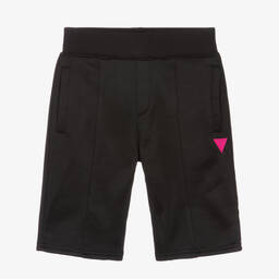 Beige Mini-me shorts for teen boys by American brand Guess, with a sporty, laid-back feel. Made in mid-weight cotton blend jersey, these casual shorts feature a neon yellow Triangle logo on one leg and multi-coloured flocked lettering on the back. They are styled with useful pockets, front pintuck seams and an internal drawstring waist for a preferred fit. This item contains recycled plastic.