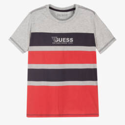 Teen boys grey T-shirt by Guess, detailed with a printed logo on the front. Striped in red and navy blue, it is made in super soft organic cotton jersey so this lightweight tee is incredibly comfortable to wear.