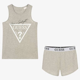 Black short pyjamas for teen girls by American brand Guess, made in organic cotton jersey. The racer-back style vest top has the designer's signature Triangle logo in white with 'Have a good night' printed across it in red. The shorts have a comfortable elasticated logo waistband.