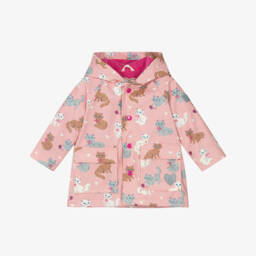 Fun multi-coloured hooded raincoat for girls by Hatley. Showerproof, it is made in smooth polyester with a polyurethane coating. Fastening with a zip, it has two front pockets, an elasticated waist, and soft polar fleece lining. There is a metallic silver star pattern and light reflective logo patches above the hem and on one sleeve.