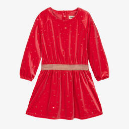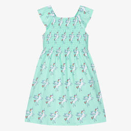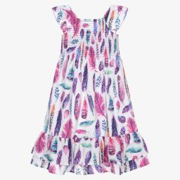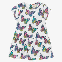 Little girls dress by Hatley, made in lightweight cotton slub jersey. The white background has a colourful striped print, with a 'love' appliqué on the front. It has a pink broderie anglaise hem and fastens with a button on the back.