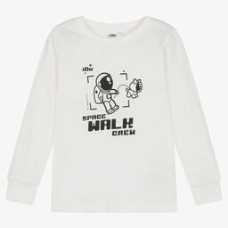 A charming puppy graphic T-shirt for boys by iDO, featuring a delightful dog motif that adds a playful touch. Crafted from soft and stretchy cotton jersey, this long-sleeved top provides comfort and ease of movement. The cosy cuffs and positive slogan prints enhance its cheerful appeal. With practical popper fastenings on smaller sizes, dressing is a breeze. Limited quantities available, making it a great choice for the cooler months.