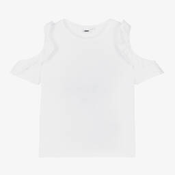 Girls sage green cotton T-shirt for older girls by iDO Junior, made in soft cotton jersey. This short-sleeved tee features a contemporary cut-out shoulder design with girly ruffles for added style. Perfect for casual spring and summer days, this limited edition piece combines comfort and fashion effortlessly. Limited quantities available, make sure to grab yours before they're gone!