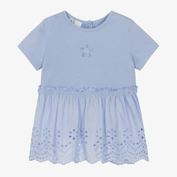 A girls white broderie anglaise T-shirt by iDO Baby, featuring a comfortable short-sleeved jersey top and a sparkling floral motif with blue and silver diamanté embellishments. The broderie anglaise peplum trim has a scalloped hem and a frilled elasticated waistband, perfect for adding a touch of elegance. Smaller sizes include convenient button fastenings on the back for easy over-the-head dressing. Limited quantities available, so do not miss your last chance to buy.