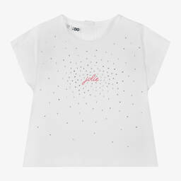 Girls white diamanté T-shirt by iDO Baby adds a touch of sparkle to everyday wear. Made from soft, comfortable cotton jersey, it features a sprinkling of diamantés and 'jolie' printed on the front in pink. The seamless capped sleeves enhance comfort, and smaller sizes include convenient logo button fastenings on the back. Limited quantities available, last chance to buy.