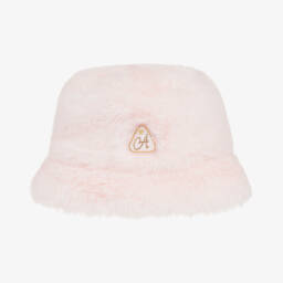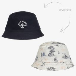 A navy blue and white hat and snood set for little boys by IKKS. Knitted in mid-weight cotton, the set has a luxuriously soft white polyester faux fur lining, with a pretty ribbed striped pattern. The hat has a fluffy polyester faux-fur pom-pom on top and they both have a rubberised logo badge stitched on the front.