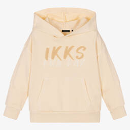 Lightweight hooded top for boys by IKKS, in ivory with blue stripes. Made in a soft and lightweight cotton blend slub jersey, It has embroidered logo tabs on the hood and an appliqué logo across the chest, together with logo stamp prints.