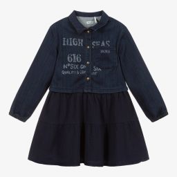 Cute pinafore dress set for little girls by French brand IKKS. The navy blue and white striped top is made in comfortable cotton jersey. It has a printed lace collar and a useful popper fastening on one shoulder. The stretchy grey cotton denim pinafore dress has frills on the shoulder straps, a front zip fastening and jetted side pockets. There is a shiny embroidered silver lightening bolt logo badge by the hemline.