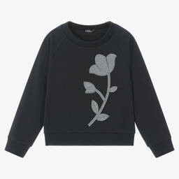 Navy blue sweatshirt for boys by luxury Italian brand Il Gufo. Made in comfortable cotton jersey with a fleecy inside, it has a white and blue polar bear motif printed on the front. There are ribbed trims and a silicone logo on one sleeve.