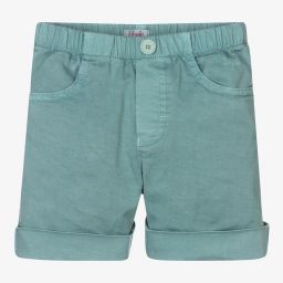 Navy blue Bermuda shorts for little boys by luxury Italian brand Il Gufo. Made in lightweight cotton twill, they have a comfortable, elasticated waistband with a decorative button and an embroidered logo above one front pocket.