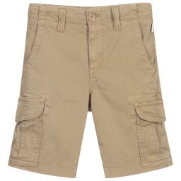 Khaki green cargo shorts for boys by Il Gufo, made in stretchy cotton twill. They have concealed button fastenings on the pocket flaps and an adjustable inner drawstring on the waistband.
