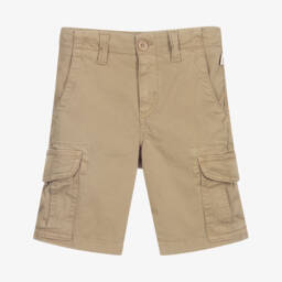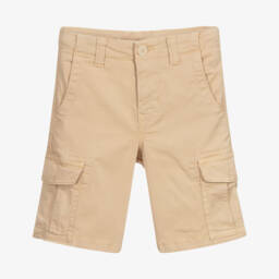 Khaki green cargo shorts for boys by Il Gufo, made in stretchy cotton twill. They have concealed button fastenings on the pocket flaps and an adjustable inner drawstring on the waistband.