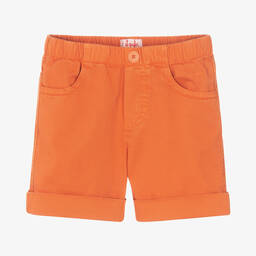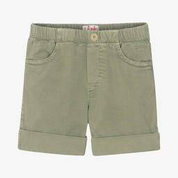 Little boys navy blue shorts from luxury brand Il Gufo. Made in lightweight cotton twill, they have an elasticated waist for a comfortable, secure fit and are finished with a decorative button. They have cute turned-up cuffs and have a subtle embroidered logo above one of the front pockets.