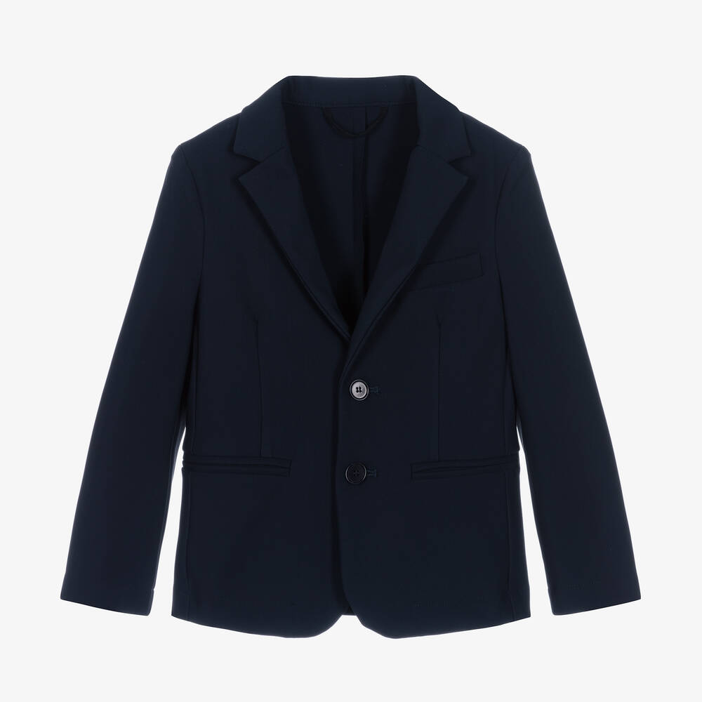 Smart navy blue tailored jacket for boys by luxury, classic Italian designer Il Gufo. Lightweight, stretchy and comfortable, it is slightly fitted with jetted front pockets. It is made in long lasting, wrinkle free, easy care Sensitive® Fabric, and has button fastenings on the front with decorative buttons on the cuffs.