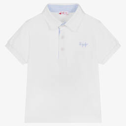 Boys white jersey polo shirt by Il Gufo offers a blend of elegance and comfort. Crafted from soft cotton jersey, it features a revere collar and a subtle embroidered blue palm tree logo that adds a touch of sophistication. Perfect for spring and summer outings, this versatile top is ideal for both casual and smart occasions. With limited quantities available, ensure this stylish piece becomes a staple in any junior wardrobe.