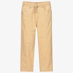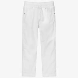 White trousers for boys by Italian brand, Il Gufo. Made out of lightweight cotton, they have an elasticated drawstring waistband and front and back pockets.