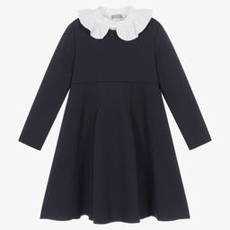Girls fuchsia pink dress from Italian brand Il Gufo. This luxury design is made in soft and stretchy Milano jersey, with long sleeves and a gently flared shape towards the hem for an elegant silhouette. Designed to appear as a shirt layered beneath the dress, included is a sweet pale pink cotton ruffle collar, removable for alternative looks and attaching with buttons. The dress fastens with a neat hidden zip on the back.