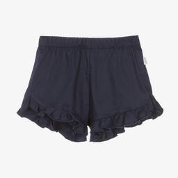 Girls smart navy blue shorts by Il Gufo. Made in smooth woven cotton with front pleats, turned up leg cuffs and two side pockets. They fasten with a zip and button and have an elasticated, adjustable waistband.