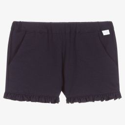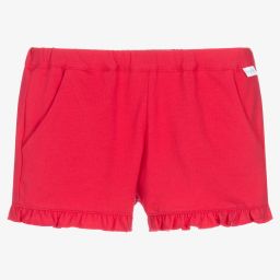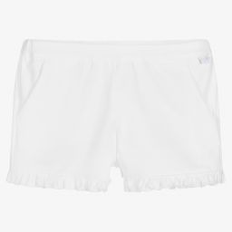 White shorts for girls by luxury Italian designer Il Gufo. Made in comfortable cotton jersey, they have jetted front pockets, with a logo tab and frilly cuffs.