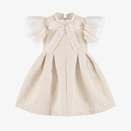 Girls blue jacquard frock by Irpa showcases a refined elegance with its woven texture and charming bow detail. The delicate jacquard pattern gives a sophisticated touch, while the structured sleeves add a whimsical flair. Perfectly lined for comfort, this dress is ideal for special occasions, ensuring both style and grace. With limited quantities available, seize the last chance to add this exquisite piece to the wardrobe.